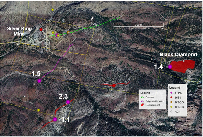 ‘The overlimit assays for silver highlight the high-grade nature of both the mineralization around the Silver King mine and the recently encountered polymetallic vein. The results confirm the significance of the recently discovered polymetallic vein as a new exploration target at the Silver King project,’ said Dr. Craig Gibson, Chief Exploration Officer. ‘Overlimit copper assays ranging from 1.11% to 2.43% copper for three samples from the replacement mineralization area provides encouraging data for this style of mineralization. The replacement mineralization occurs along strike with the stratigraphic horizon at the nearby Magma mine and occurs as a large body on the Black Diamond claim.’