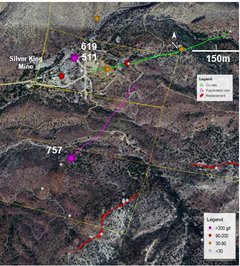 Figure 1 . Geologic and land map of the Silver King project showing newly described polymetallic vein in magenta (Ag-Pb-Zn), copper vein in green (Cu-Ag) and stratigraphically controlled replacement mineralization in red.  The strongly altered intrusion with stockwork quartz-pyrite veining is indicated by the crosshatch.