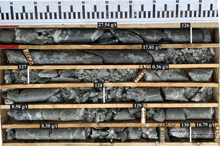 - Within Diorite 2 between 125–138 meters: 13 m of 6.12 g/t Au , including 2 m of 22.28 g/t Au