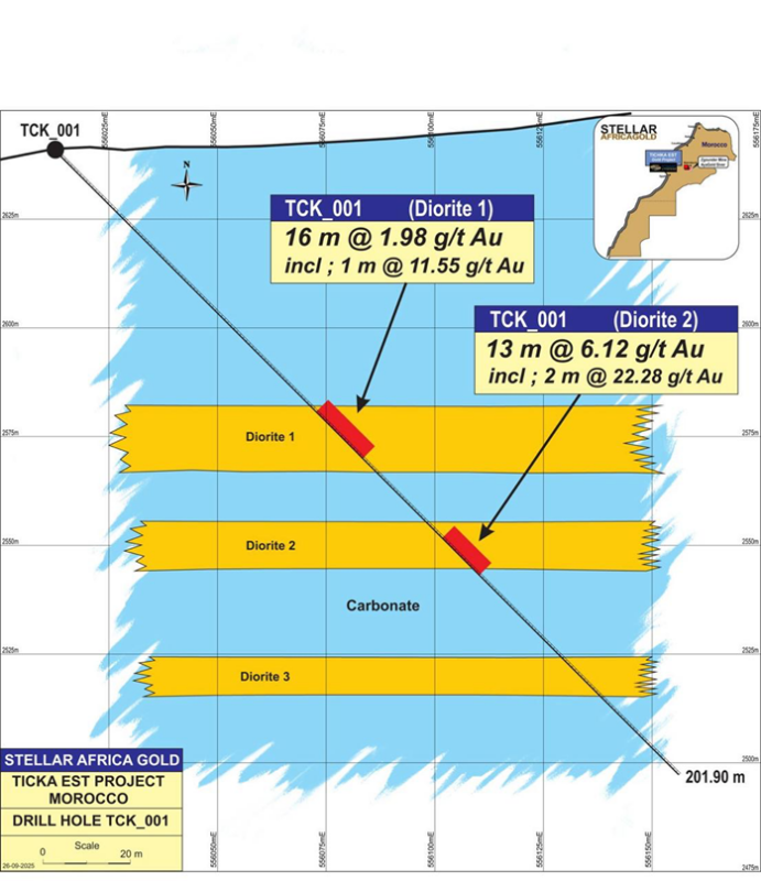 Vancouver, British Columbia TheNewswire – October 2, 2025 – Stellar AfricaGold Inc. (TSX-V: SPX) (‘Stellar’ or the ‘Company’) is pleased to report significant assay results from its first drill hole at the Tichka Est G old P roject, part of the ongoing 1,500-meters summer diamond drill program at the Zone B gold discovery, an area of approximately one square kilometer within Stellar’s 82km 2 permit area in Morocco.