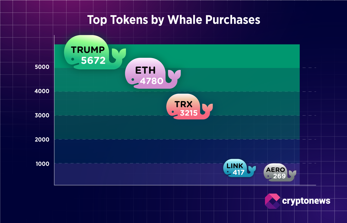 According to Cryptonews data, Official Trump (TRUMP) ranked first by the number of large transactions (each worth over $50,000), outperforming even Ethereum (ETH) — the asset long seen as the “main” altcoin. Rounding out the top five were Tron (TRX), Chainlink (LINK), and Aerodrome (AERO).