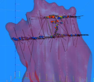 Figure 3: Screen shot of 3D model of Dos de Mayo vein (purple) in the Pinos Cuates Mine, showing high-grade gold and silver samples (red, yellow and green) and proposed drill holes to test extension of mineralization