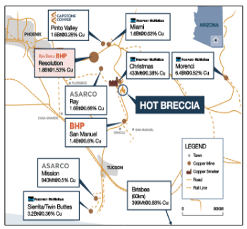 Prismo‘s Hot Breccia project lies at the heart of the Arizona Copper Belt, which hosts several globally significant porphyry copper deposits.  Examples of these significant deposits are Freeport McMoRan’s Miami-Inspiration mining complex, BHP’s San Manuel mine, Rio Tinto and BHP’s Resolution deposit and others (see Figure 1).
